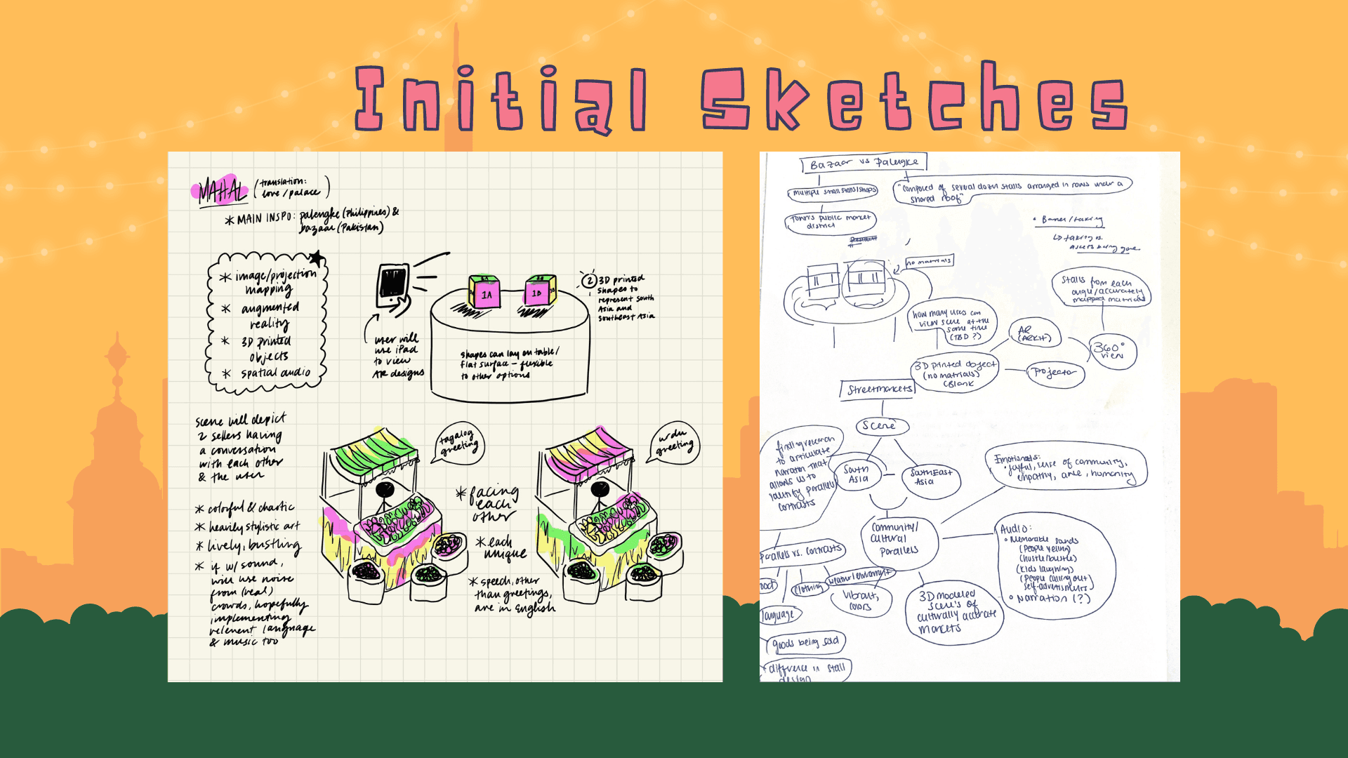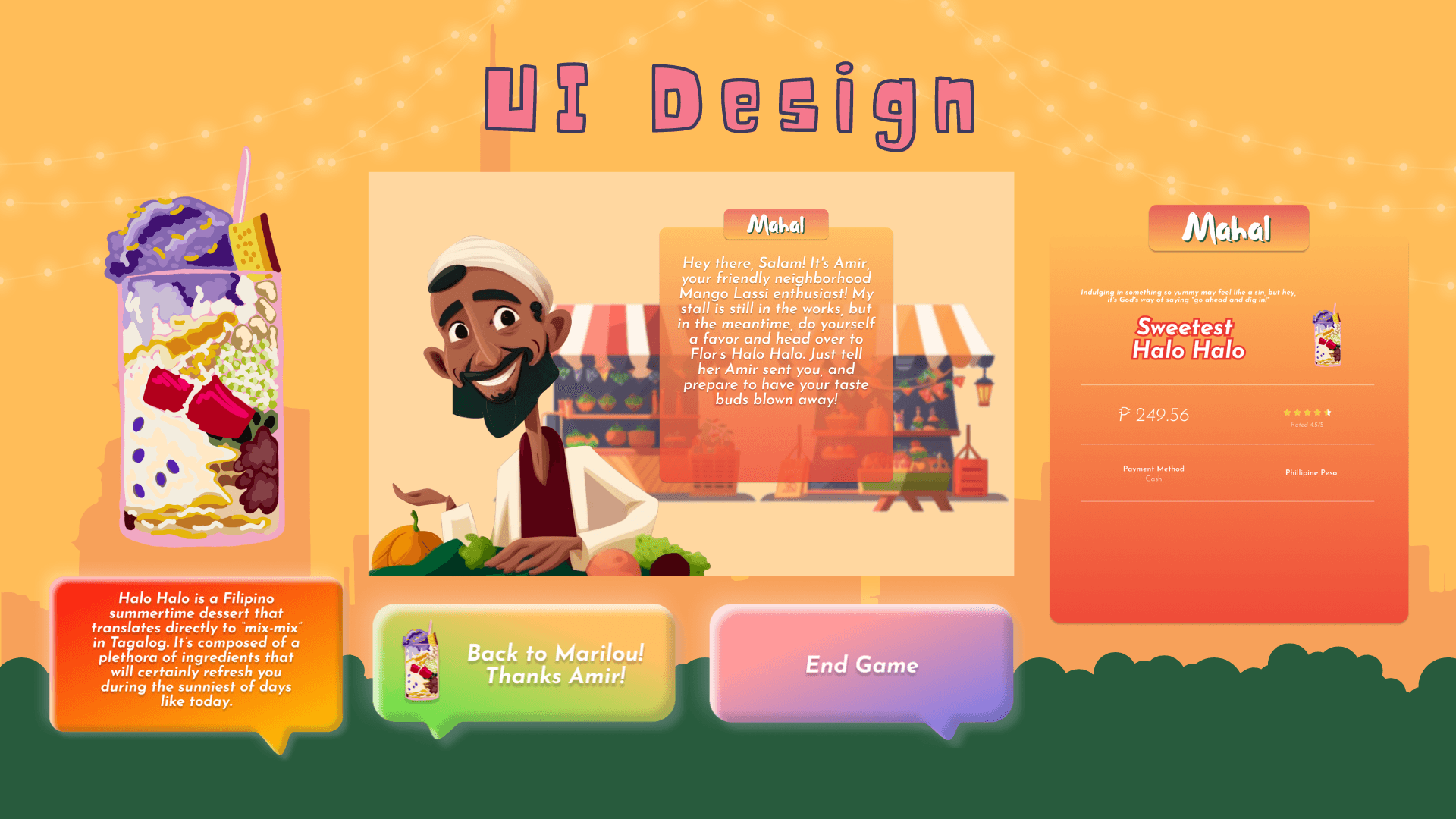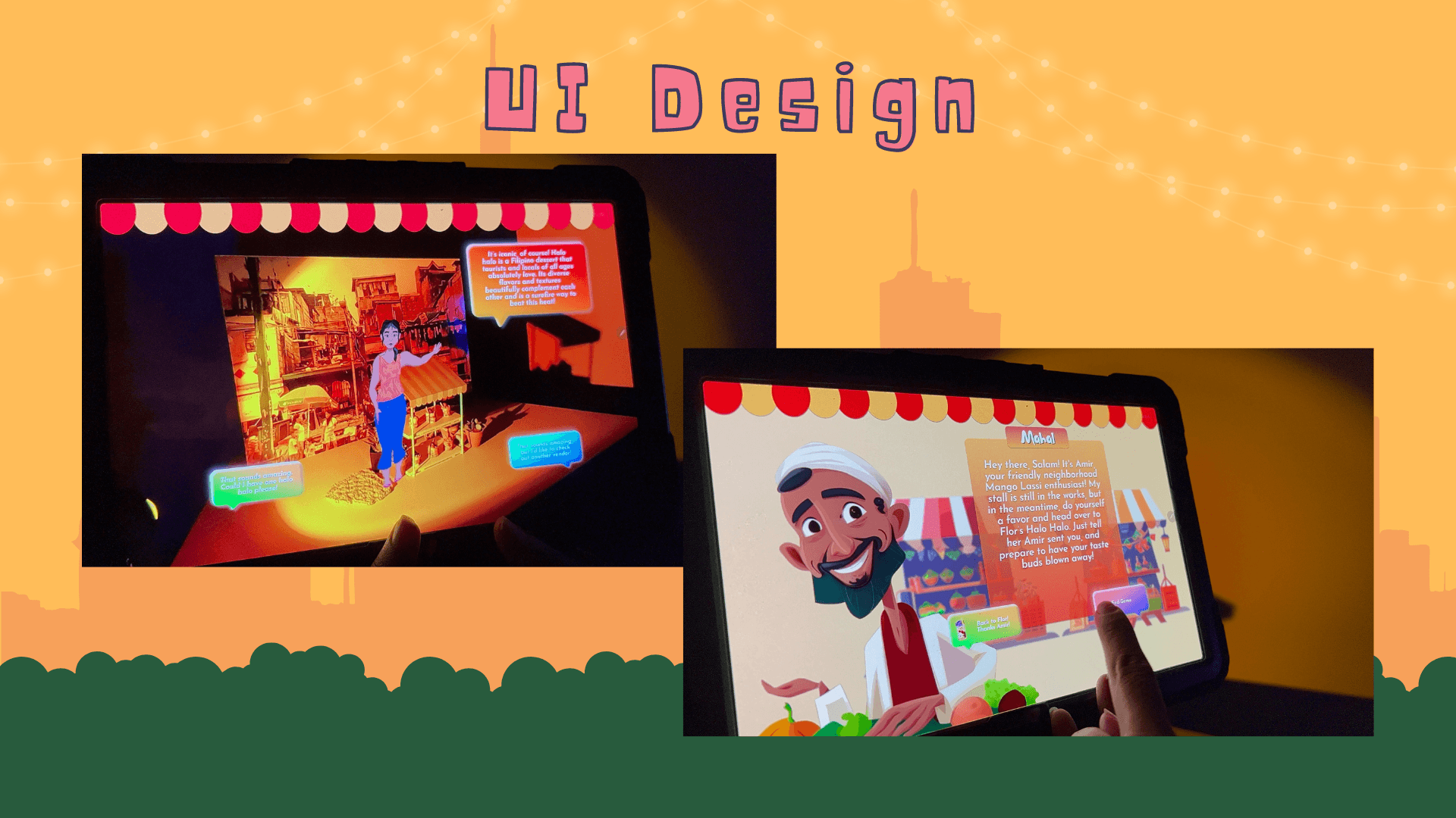 Chaotic, crowded, colorful. “Mahal” is an augmented reality experience that simulates the energetic environment and close-knit community within Southeast Asian street markets. Users are transported to the hottest day of the summer, where they can interact with a vendor who is selling delicious Filipino desserts that can beat the tropical heat!